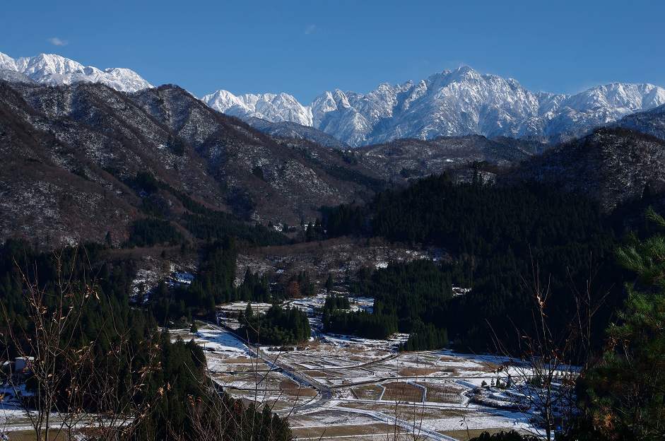 時間も遅いので、折戸トンネル過ぎの凍結した下り坂の心配はない。伊折集落までは完全に雪は融けている。そこからゲートまで除雪はしないが、轍が残っていたのでその跡を辿って車でゲートまで入ることにした。ゲート付近は膝下までの積雪があり、轍はゲートの向こうへと続いていた。おそらく県警の車が雪上車を止めてある地点まで向かったのであろう。伊折から馬場島まで、この雪上車の圧雪のおかげでずいぶん歩きが楽になる。正月までは降雪後に動いてくれているので、年末年始に剱方面に向かう登山者にとっては大変ありがたい。 山に入るには遅い時間だし、スノーシューも積んでこなかったこともあって、ゲートから先は進まず、青空をバックに雪煙を上げる剱の表情を目とカメラに焼き付けるにとどめた。 それから車を返して、ハゲ山を目指し種の集落に向かった。 いつものとおり、道路沿いの建屋の近くに車を止めて歩きだす。30分そこそこで山頂に到着。剱それ自体の眺めはもちろん最高だが、眼下の種の盆地を手前に見て、その奥にそびえる剱と対になった風景がまた一段と奥行きを感じさせ、とてもよい。 ハゲ山は本当に近くてよい山だ。