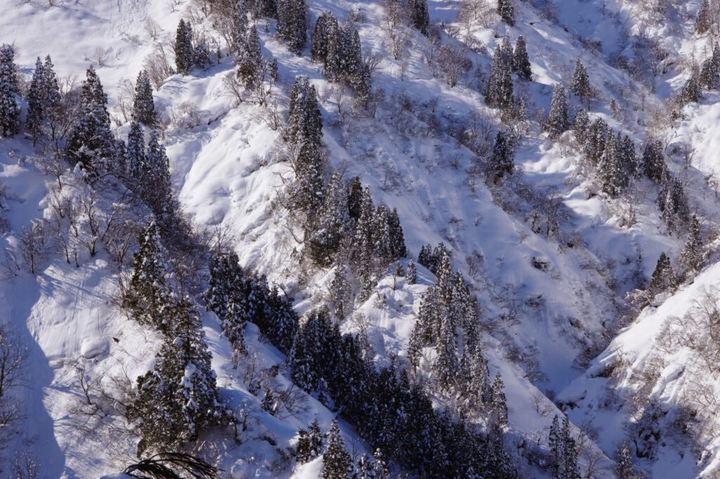 伊折もやはり雪が多い。馬場島へと向かう道はまっさらな雪で完全武装状態。今日の雪はなんか変。踏み込むと、グググーッと膝下までやんわり沈み込んでいく。軽いのか重いのかどっちだか、分厚い低反発クッションのマットに足を踏み入れたような気分。あるいはジムにあるクライミングマシンの踏み込みにも似た感触。時間もかかるし、一歩一歩が非常に疲れる。同じ沈み込むにしても、軽い新雪の方がはるかにまし。歩き用のファットスキーが欲しいと本気で考えてしまう。 そんなだから、なるべく道路脇の杉の植林帯を歩くことにした。杉林の中は落雪が固まって歩きやすい。それでも道路に戻ればまたズボズボと沈み込み、遅々として先が見えてこない。これでは馬場島まで一日かかっても辿りつけない。たまらず、剱センターすぐ手前の屈曲点から右の植林帯にエントリーして、いつものごとくあてのない徘徊と決め込んだ。 となれば、あとは剱展望の地を目指すだけ。高度を稼いで開けた場所を探すが、そこに出れば出たで周囲の藪がうるさく剱の眺望が閉ざされている。そしてまた次の場所を求めて登りだす。顕著な尾根に出てからは登行もやや楽になり、700を超えてからは軽くなった雪を蹴散らしながら行く。そして待望の場所へ。そこは標高800ちょい手前で、立山杉がちらほら目に付きだす地点。そこだけ灌木が途切れた恰好の剱岳眺望の斜面があった。ここまで、飲まず食わずひたすら歩き続け、3時間。ようやく満足のいく地点を見出し、今日の行動を打ち切ることにした。