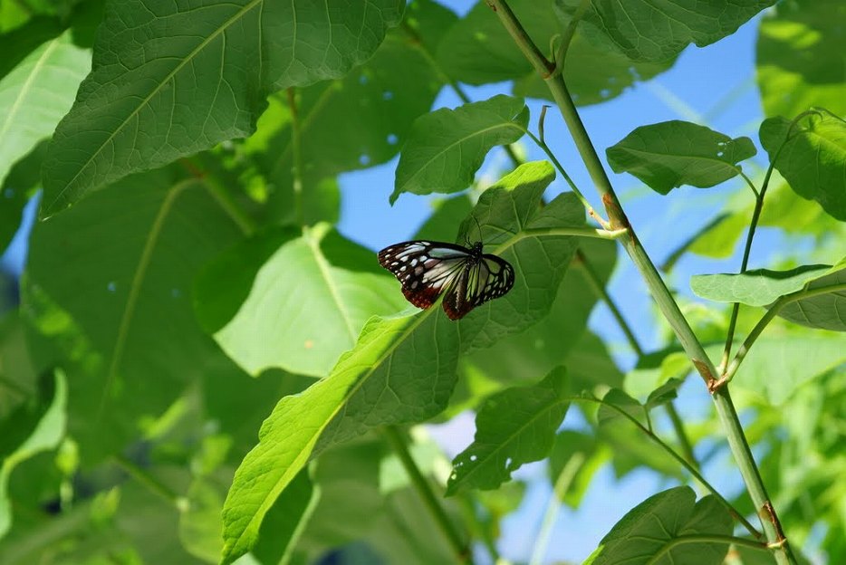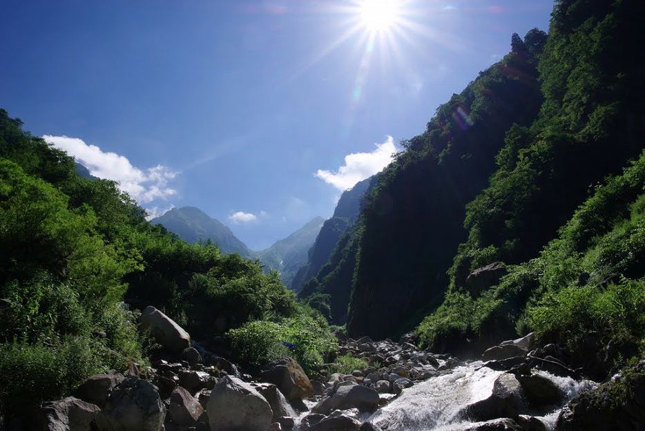 今回、その高巻道の様子を確かめに行くことにした。 。 道中はほとんど陽が当たらず、朝露がパンツを濡らす。盛夏ならかえって気持ちの良い濡れ具合。道はうまく付けられていて、なんなくゴルジュ正面近くで一旦河原に降りるがすぐにまた左へと道は進み、一尾根超えて雷岩の河原に降り立つ。渡渉して小窓乗越へのルートを探してみたかったが、水の勢いが激しく、ジャンプして滑るのもいやなので、止めることにした。 河原沿いにちょっと歩くと、きれいな蝶が葉っぱの裏で羽を広げて休んでいた。大きな羽にはステンドグラスのような縁取りがあり、逆光に透き通って輝いていた。そういえば道中この蝶が好むフジバカマに似た花がたくさんあった。そして、足元を見ると、どこかで見たことのあるウメのような小さな白い花が目に留まった。葉っぱの形状から多分ウメバチソウ。となれば他にも咲いているかと、周辺を探したか、咲いていてのはその一株だけだった。近いうちに、また確かめに来なければいけないだろう。 取水口起点 1170まで2時間 帰り1時間30分