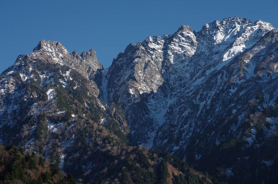 なんとか日が稜線から出てしまう前にと、取り付きからの急登を駆け上がる。藪が少しだけ開ける1100から1200まで後ろを振り返りながら行く。まもなく日が出るであろうという頃あいと三脚を立てることが出来る斜面との見極めが難しい。もう30分早く出ていれば焦ることはなかったのだが、この辺が限度とみてザックを下ろした。だが、なかなか日が上がってこない。もう少し上まで行く時間があったようだ。そうすれば、もっと奥行きのある写真が撮れていただろう。どうしても木々と藪が邪魔をする。 日が出始めてきたのでカメラを仕舞い、山頂を目指すことにした。大猫平まではゆっくりながらも息が上がることはなかったが、最後の稜線上部から足が重くなり、主稜線に出てからは体も重く、一気にペースダウン。お地蔵さんの小ピークでは、もう止めようと思ったくらい。それでも、タイムリミットと定めた11時まではまだ少しあるので、時間までくるぶし位までの雪の稜線を進むことにした。 雲ひとつない快晴。遠くは白山まで見渡せる。標高こそ2100そこそこだが、苦しさから言えば2400の大日岳よりきつい山だと感じた。