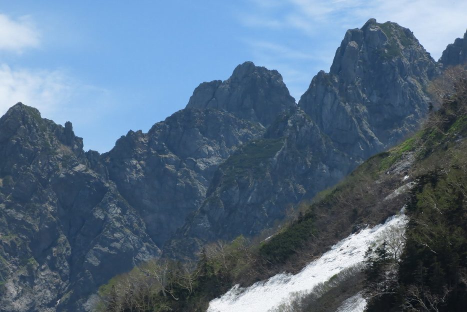 1200付近から続いていた残雪の斜面はすでになく、ただ夏道を行くのみ。1700付近で一旦残雪を踏むが、すぐに登山道に入る。1900から左に残る残雪を拾ってなごりの春山を楽しむ。というか、夏山ジョイに近い気分。 周辺の山々も雪解けが進み、山肌の白い部分がはるかに少なくなっている。かといって夏はまだ始まったばかりで、山全体が濃い緑に覆われるまではもう少し時間がかかる。 一先ずの目標としていた早月小屋に到着。雪が完全になくなった小窓尾根が目に飛び込んでくる。雪のガウンが外された今、山肌はもろい瓦礫が露出しているように見え、心なしかひ弱な印象を与える。静寂で荘厳な剱のその場所に独り座り込んで、剱の一部に融け込む気分はなんともいえない。ナッツとオレンジーナを飲んでから下山にかかる。
