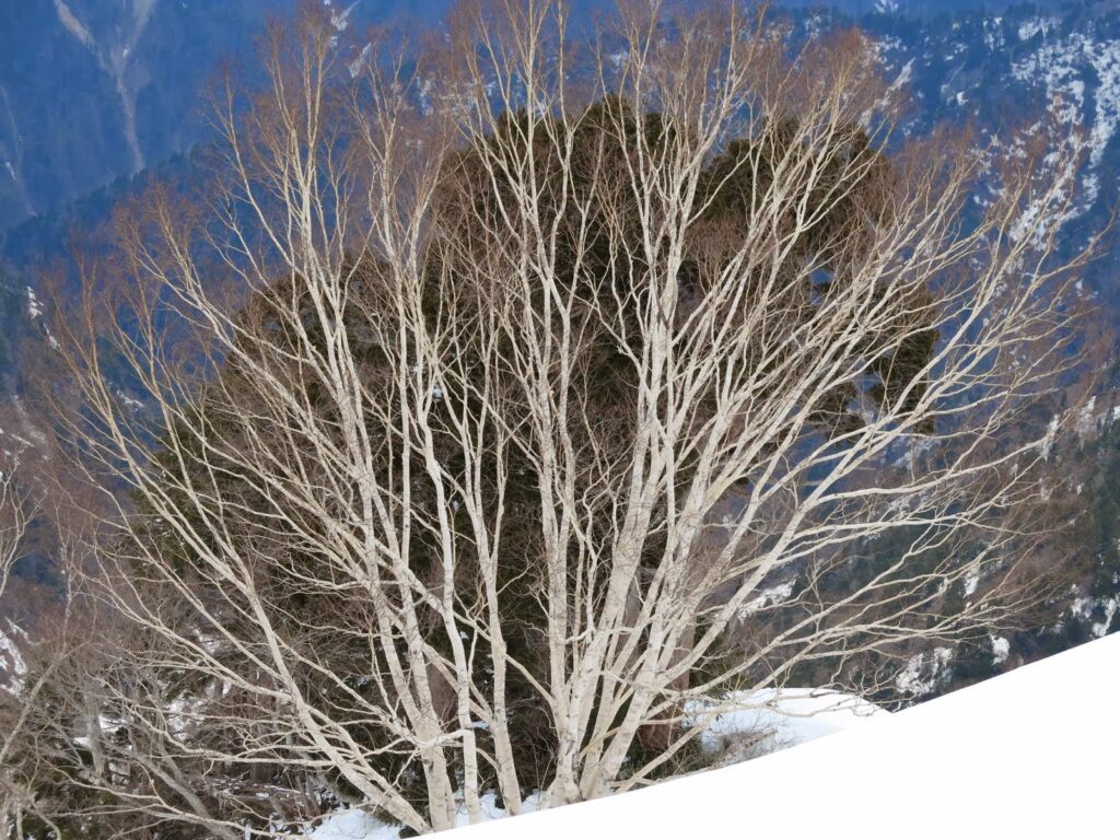 小又橋からは林道を行く。心配していたほどの斜面の危険は感じなかった。尾根の末端でアイゼンを装着し真正面から取り付いた。1024の丸山に出るまでは雪が切れ切れでしょわしない。1024からは雪がベッタリ、熊の足跡に導かれるようにして上を目指す。 1320を過ぎ、なんなく1420に到着。ここまで1時間20分、自分としてはまぁまぁのペース。主稜線まであと600、あと2時間もあれば余裕だろうと思っていた。 だが、ここで一本取って、動き出してから、変な胸騒ぎ。文字通りいつもの心臓の暴走が始まった。そこで、ペースを抑え、カメカメ大作戦に出る。だましだまし1700まで。280登るのに1時間。小又橋を出るときに飲んで来たが、再度シベノールを投入。歩いてるうちに効いてくるだろうとの腹づもり。しかし、1820までの120が1時間。そのあと30メートル行くのに20分。この間、動くたびに虚血状態になる、全身に力が入らず、気が遠のいていくような感じ。息を整えるというよりも、動悸が収まるのを待つ。そして、あの引きずり込まれるような恐怖感。なんでこうなるの?ここで打ち切ることにした。 シベノールが効かないのならワソランでも。気休めかもしれないが、一錠飲んで下りにかかる。下ってみてびっくり、こんなにもダケカンバが多い尾根だったのか。登っているときはほうほうのていで、まわりを眺める余裕などさらさらなかったのだ。こうしてみると、とてもよい尾根だ。何度登っても飽きの来ない山があるが、この尾根もその一つ。 1320からは左のルンゼを拾って一ノ谷に出て、コット谷に降り立った。