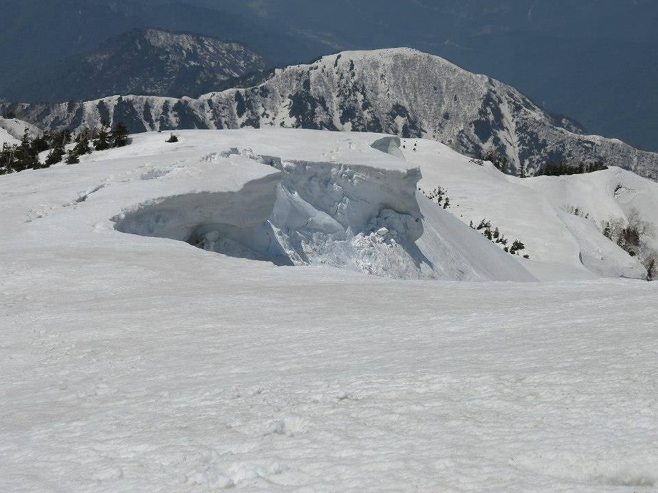 10日前、ほうほうのていで、逃げ帰って来た山ノ神尾根、そのリベンジのときが来た。 この数日間で山は随分と春がすすんだ。山ノ神尾根末端は雪がなく、とても取り付ける状態ではない。そこで前回下りに使った、1320に抜けるルンゼを利用しようと一ノ谷へと向かう。だがしかし、そのルンゼも上部の様子が分からず断念。どこか取り付ける雪渓がないか探しながら、デブリランドと化した一ノ谷を遡る。1300あたり、地形図では「一ノ谷」の「谷の字」付近で谷は二股に分かれる。といっても右が明らかな本流、左は狭い支谷。その左の谷を辿っていけば稜線付近まで雪がつながっていそうな気がする。しかし、その谷は茶色いデブリで覆われており、どうしたものかと考えてしまう。その支谷と尾根を挟んですぐ手前の浅いルンゼ状雪渓にも雪がたっぷり付いており、こちら真っ白で汚れていない。熊が遊んでいるところを見ると、安全な雪渓に違いないと判断し、こちらを辿ってみることにした。 このルンゼ、傾斜も程良く、足にもやさしい。200ほど登るとちょっとした草付きで進路を妨げられるが、そこを右へと乗っ越してビックリ。左手の主稜線に沿って、だだっ広い雪の斜面が上部へと続いている。まさしく天国への坂道、そんな表現がピッタシの雪渓が空へと向かっている。はたしてどこまで続くのやら、気分もよろしく足取りも軽い。そしてその雪渓を抜けたところが1763であった。末端尾根から取り付くのもよいが、このルートはこれとして、通常ルートとして使えるのではと感じた。春山はこれだからいい、雪のあるところを好きに歩けるからだ。 1763といえば前回体調不良のためウロウロしていた地点。今日はそんな気配は全くない。それどころか、クライマイーズハイが全身を包み込む。ひたすら雪の尾根を辿るというえも言われぬ感覚に酔いしれていた。途中雪が切れていてやわしいところもあったが、慎重に乗っ越し、二山、三山超えて主稜線に出た。勝利と達成の喜びを絞り出すようにして雄叫びをあげる。
